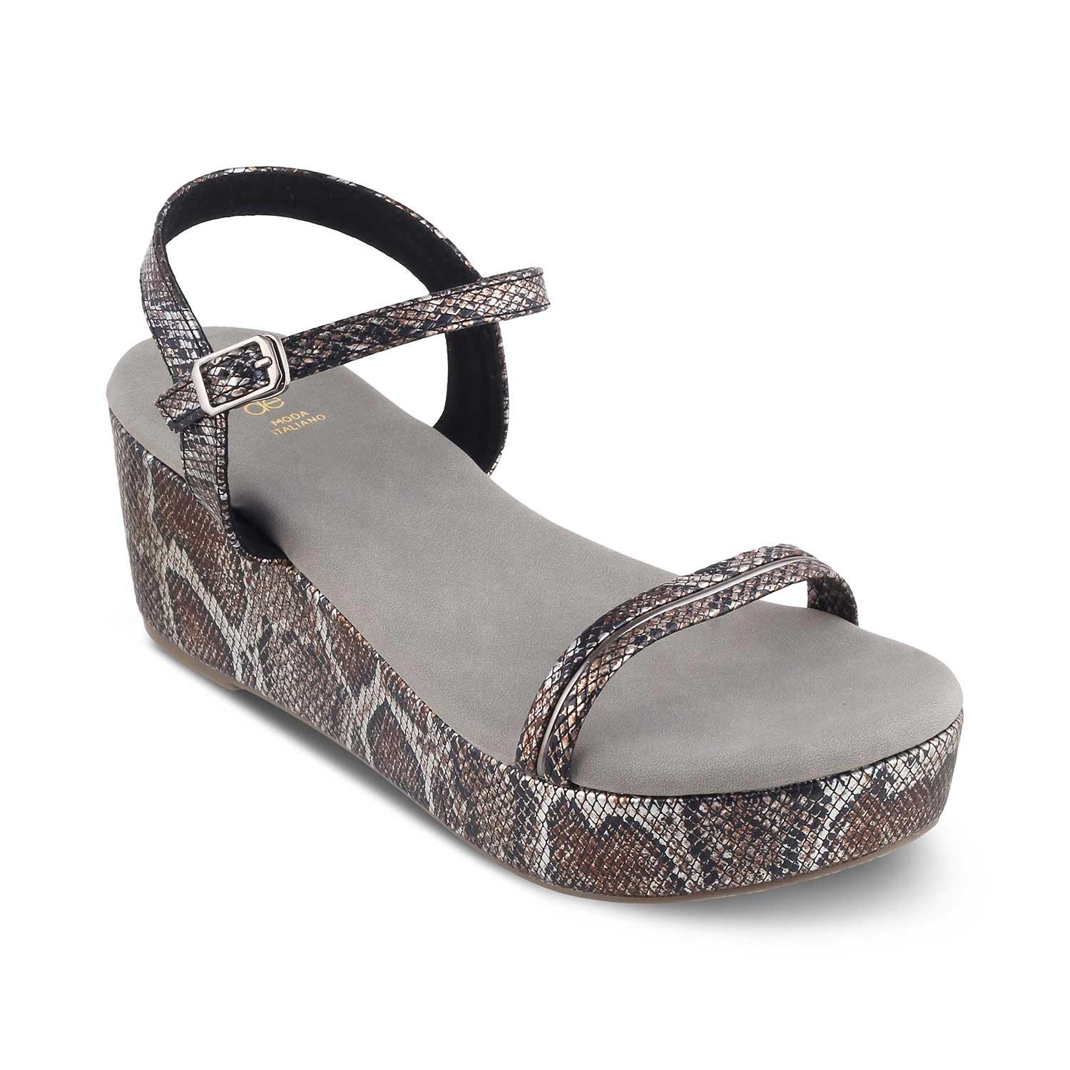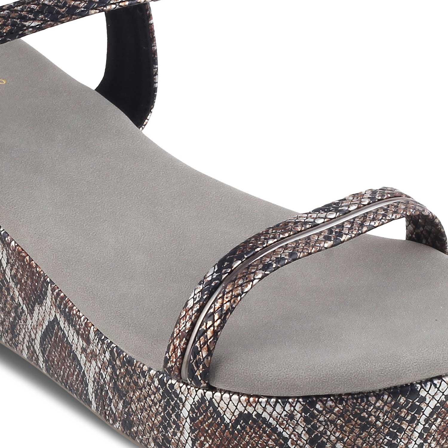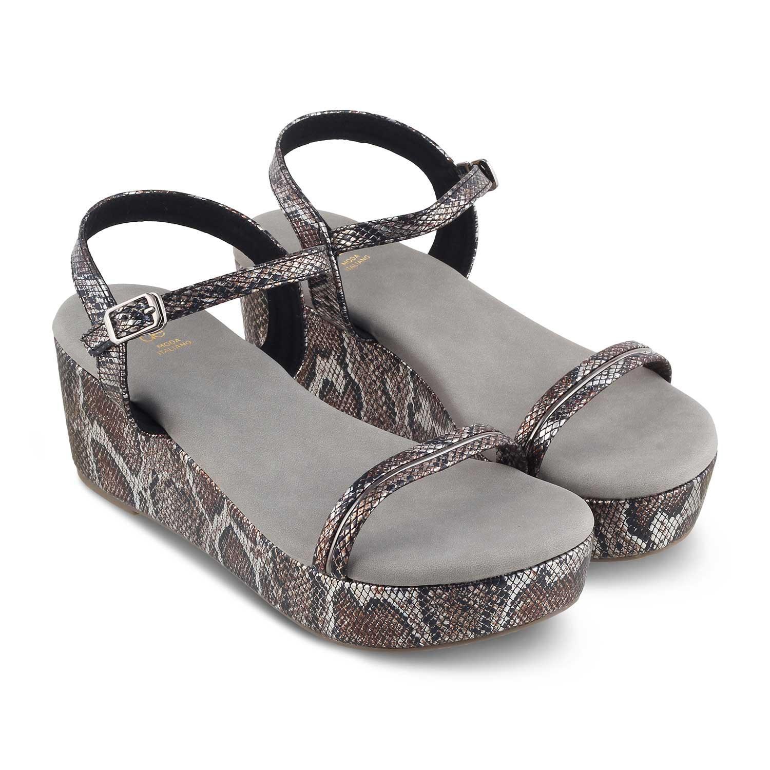 Make a striking fashion statement in our Anger pewter women’s wedge heel sandals. Featuring a chic snake-pattern design, these vegan-friendly wedges will give your look an instant lift. Step out in confidence and make a fashion statement while keeping your feet happy and comfortable. Pair them with a black and white polka-dotted dress for a party.