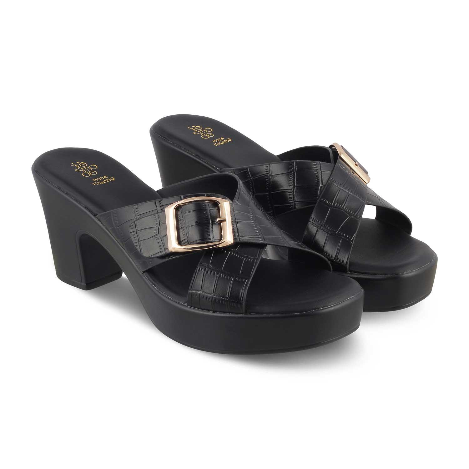 The Argentia black women’s block heel sandals are all things stylish! At your next party, keep up with the glam factor without letting go of the comfort quotient. These sandals feature glossy straps, a sturdy block heel, and a TPR sole. Look fabulous by pairing these sandals with a black bodycon dress and add some accessories.