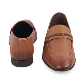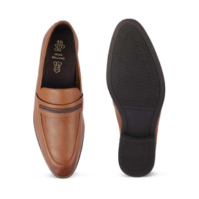 Our Bochum tan men's leather loafers blend style and elegance. These loafer shoes have been crafted in genuine leather and have a durable TPR sole. Designed with a woven leather strap, this pair will become a timeless piece in your wardrobe. Style these shoes with a business-casual or formal attire and make a classic fashion statement.