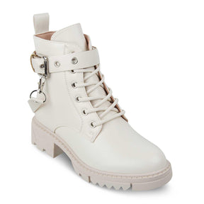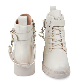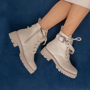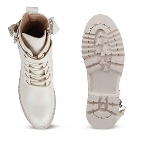 Elevate your winter look with our Brace beige women’s military style combat boots. Featuring a 1.5-inch heel and created from premium PU material, these boots will enhance your sense of style while offering stability and a good grip. Make a fashion statement by pairing these boots with a beige sweatshirt and black cargo pants.