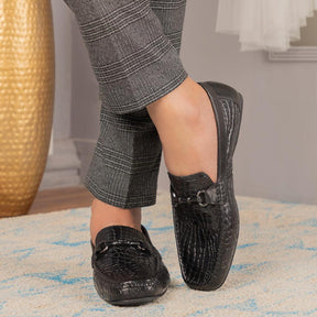 Introducing our Croter black men’s leather loafers! Crafted in premium Italian textured leather, these stylish shoes will make the best addition to your footwear collection. For a classic look, style these loafers with a beige striped slim-fit cotton shirt and maroon trousers.