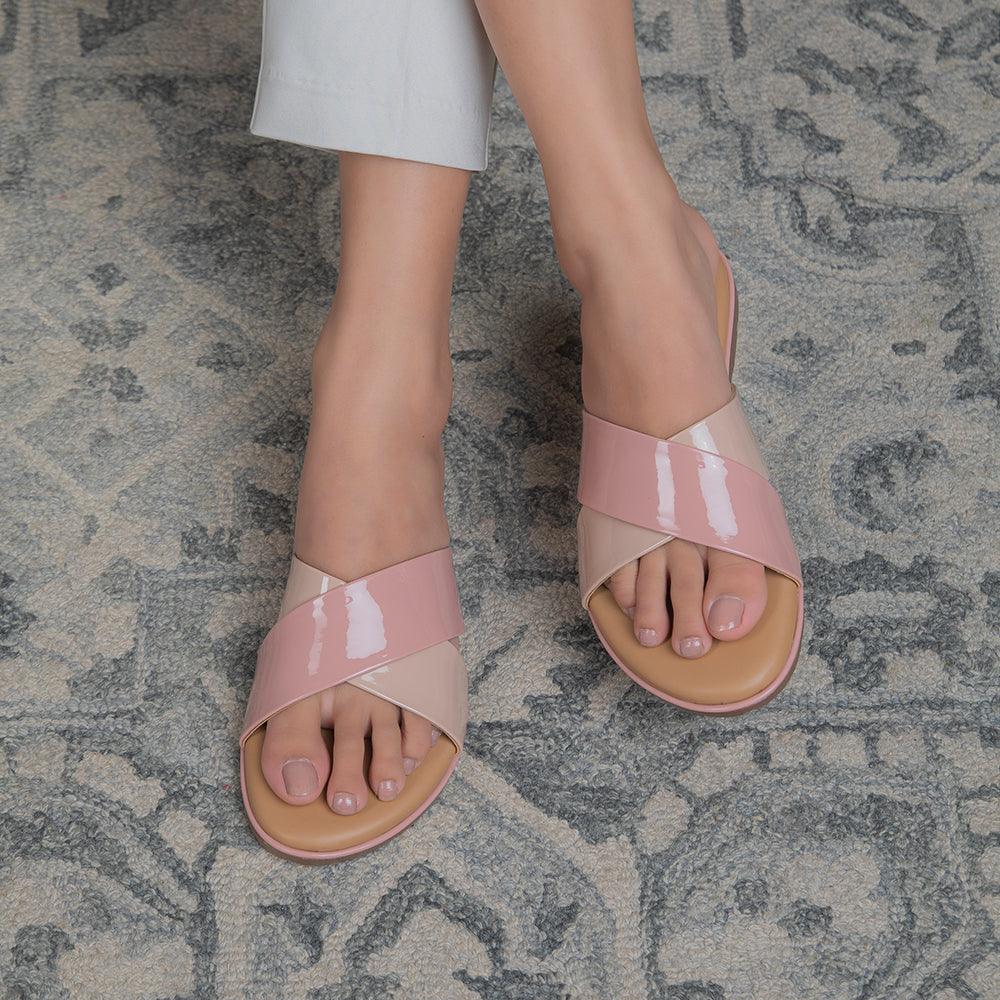 Enhance your everyday style in our Cyne pink women’s flats. Featuring dual-colored straps and a comfortable TPR sole, makes this pair a must-have for daily wear. For a casual look, style these flats with a pink playsuit for the perfect summer look!