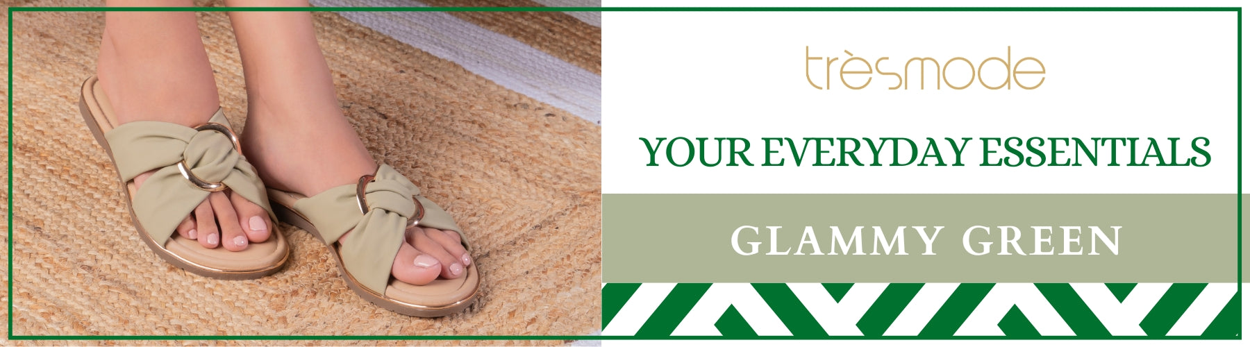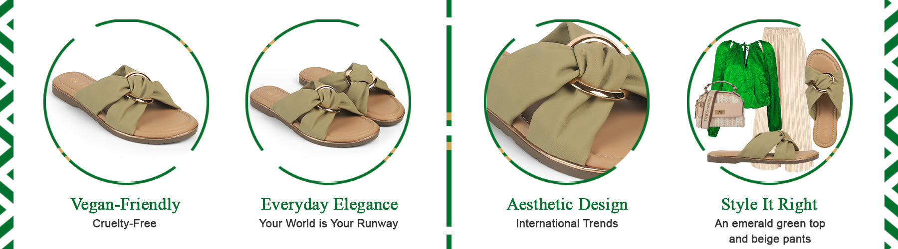Our Glammy green flats for women will upgrade your everyday style. This vegan-friendly pair blends style and comfort, which makes it an ideal addition to your casual collection. For your daily look, pair these flats with an olive green top and a white pleated skirt.