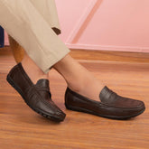 Elevate your formal look with our Lemec brown men’s penny loafers. This pair has been designed with precise detailing and crafted with premium Italian leather to offer luxury and comfort. For a sophisticated look, style these shoes with a black and white striped shirt, brown trousers, and a smart watch.