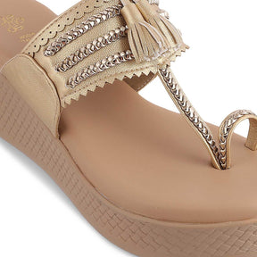 Make a bold fashion statement with our Makol Gold wedge sandals for women. Designed for modern women, looking for that perfect blend of style and practicality, these wedges will be your go-to. Flaunt your style game by pairing these stylish flats for women with a black v-neck top and white leggings.