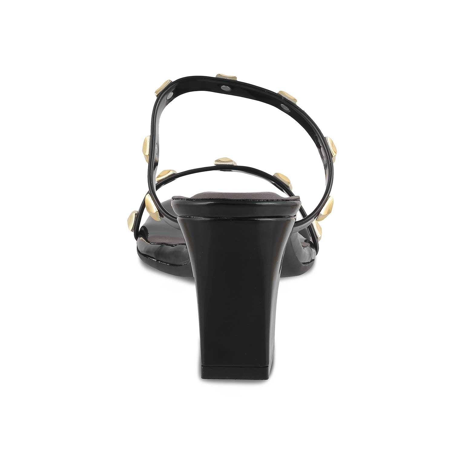 Make a bold fashion statement in our Megan black women’s block heel sandals. Featuring golden studs, a sturdy block heel, and a stylish square toe shape, this charming pair is a must-have for this party season. Look drop-dead gorgeous by styling these sandals with a black slit midi dress and silver pearl earrings.