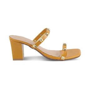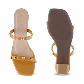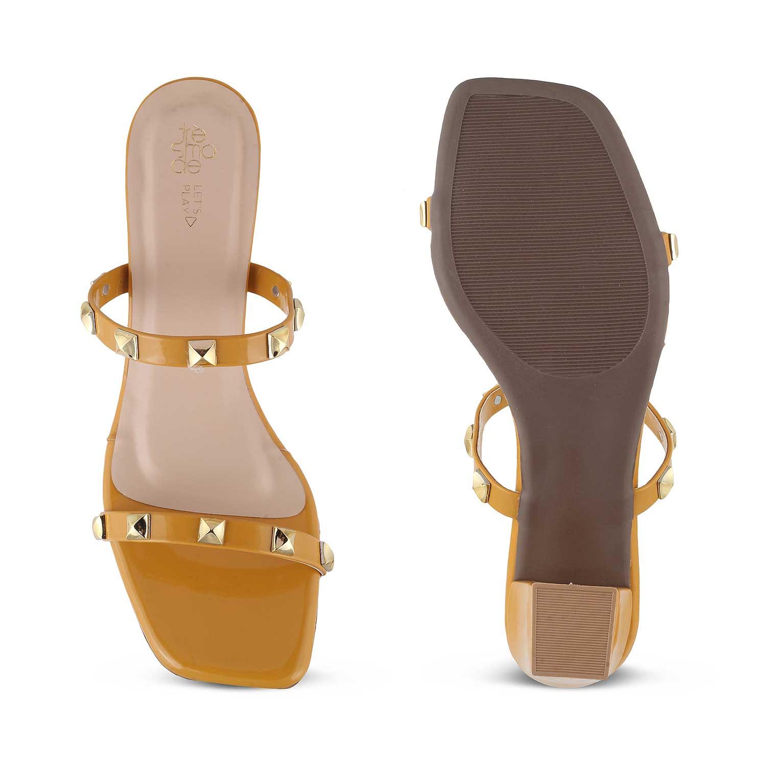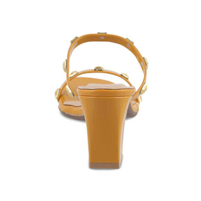 Make a bold fashion statement in our Megan yellow women’s block heel sandals. Featuring golden studs, a sturdy block heel, and a stylish square toe shape, this charming pair is a must-have for this party season. Look drop-dead gorgeous by styling these sandals with a lemon yellow butterfly sleeve dress and golden hoop earrings.