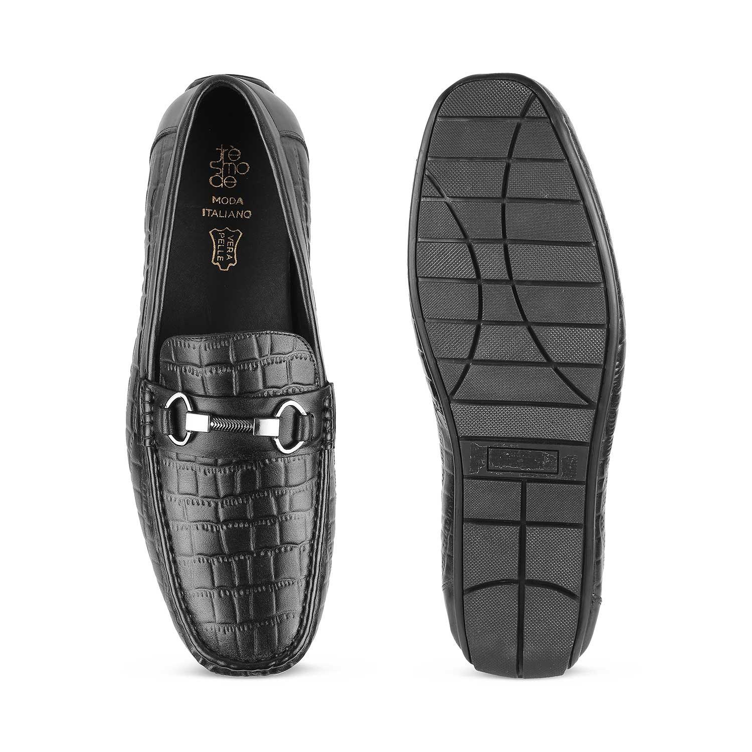 Elevate your fashion game with our Miluck black men's leather driving loafers. With a trend-setter croc embossed pattern and a metal buckle on the upper, these premium genuine leather driving loafers are ideal for a dapper look. Make a great style investment by adding them to your collection. Get ready to take every step confidently by pairing your outfit with these loafer shoes for the next work meeting.