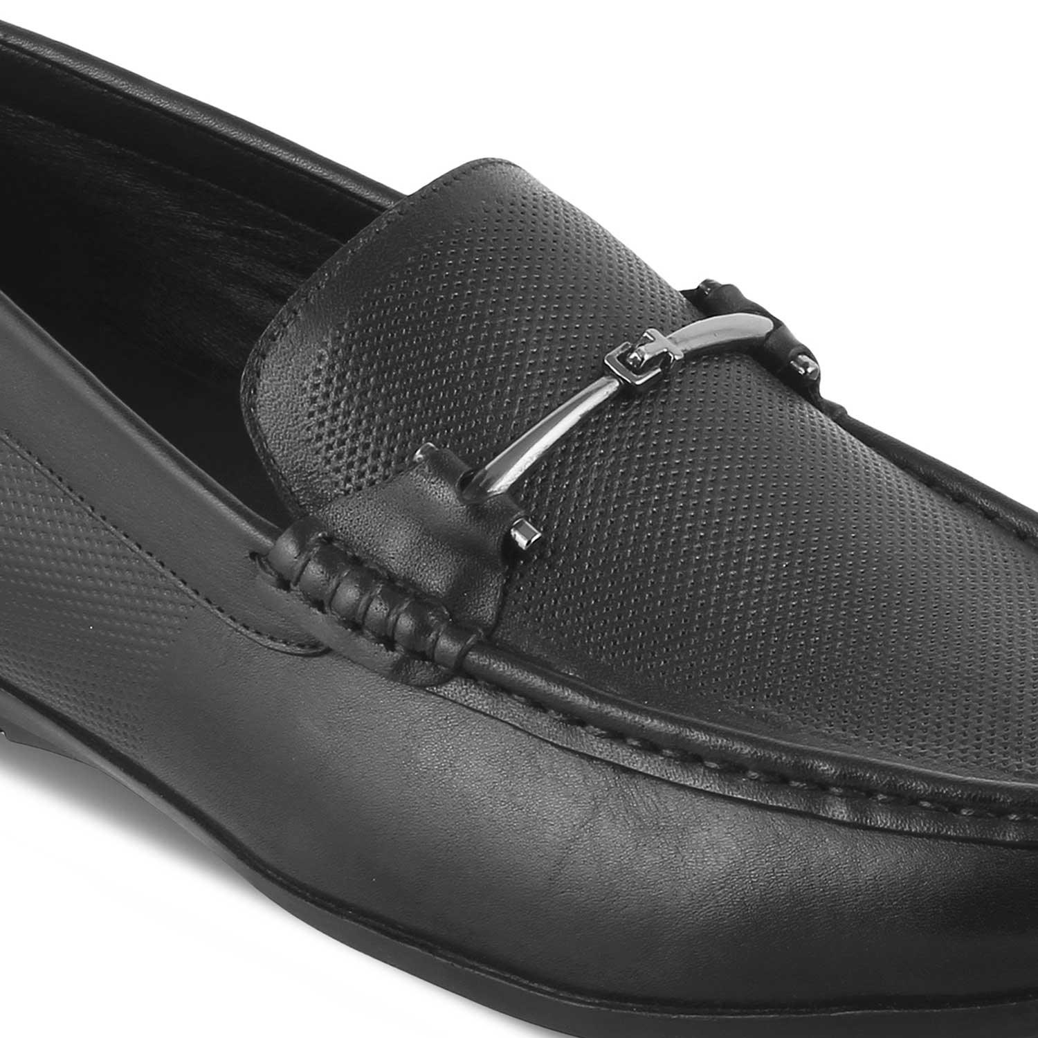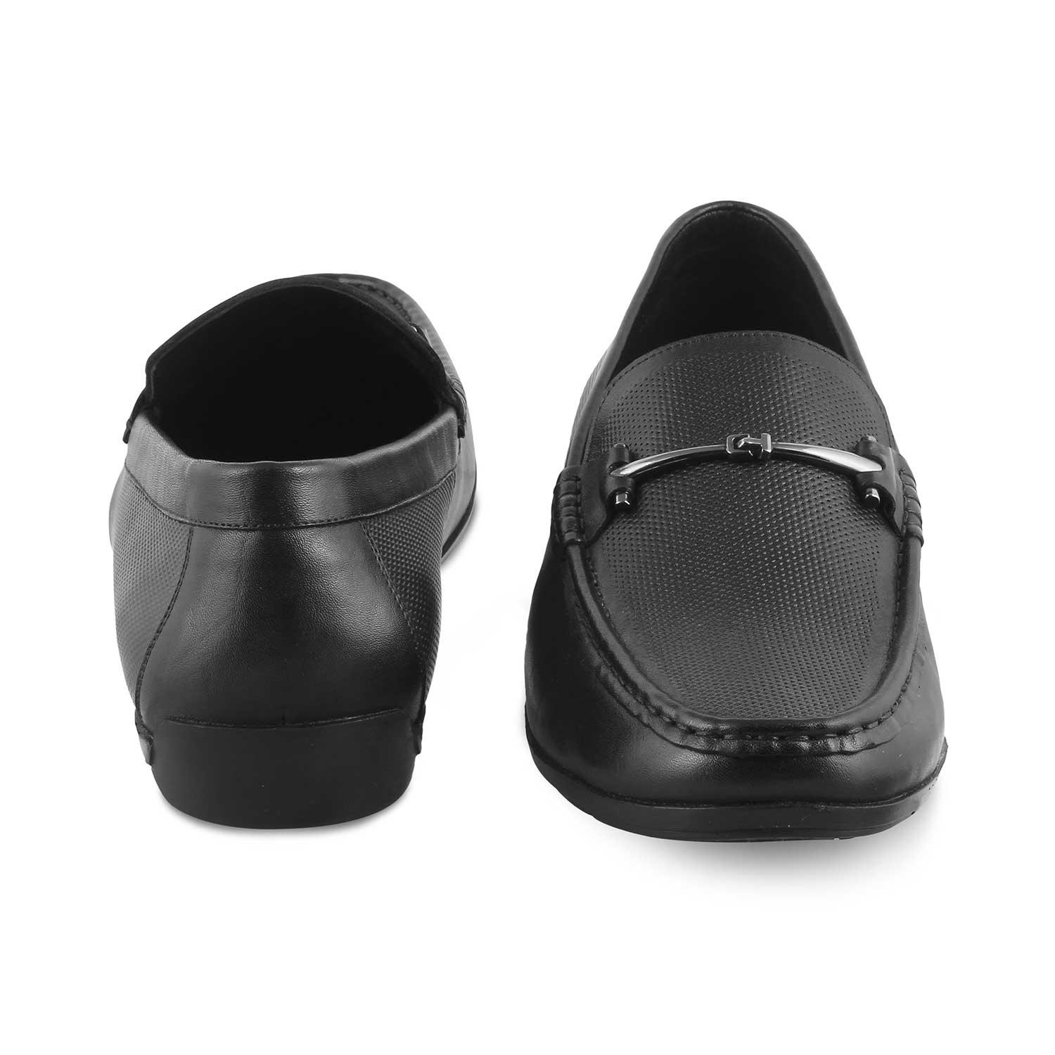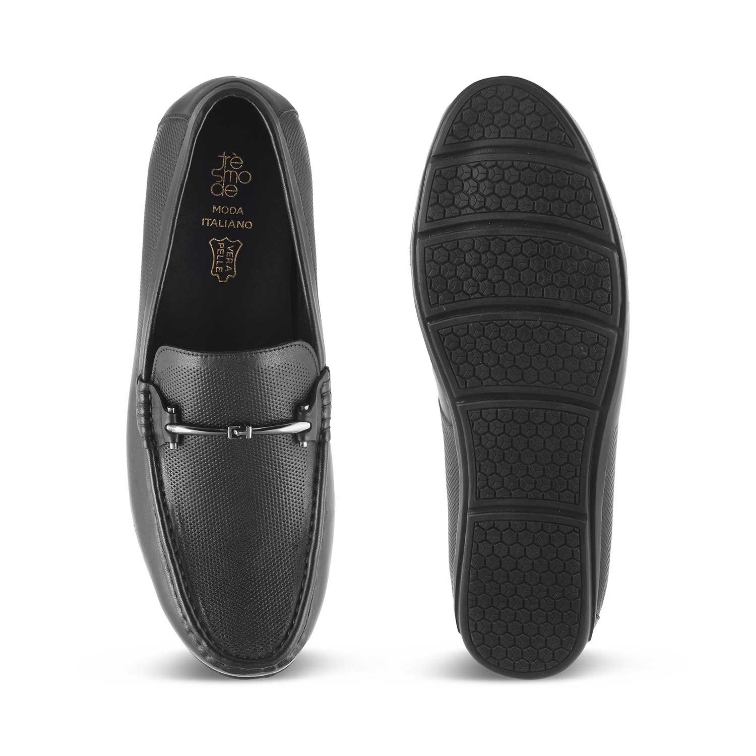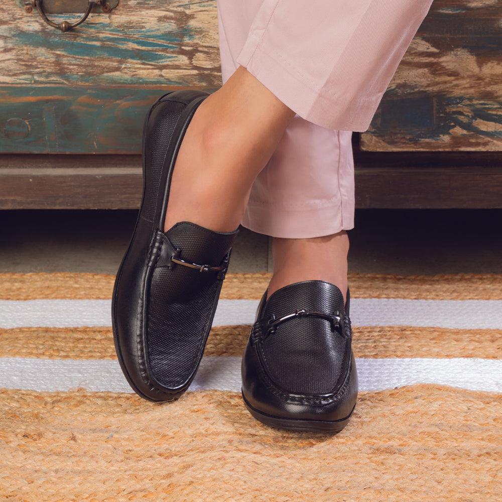 Flaunt your look by adding our Nimbia black men’s loafers to your collection. These leather driving loafers are known for striking a balance between fashion and functionality. For a dapper look, style them with an off-white shirt and brown trousers.