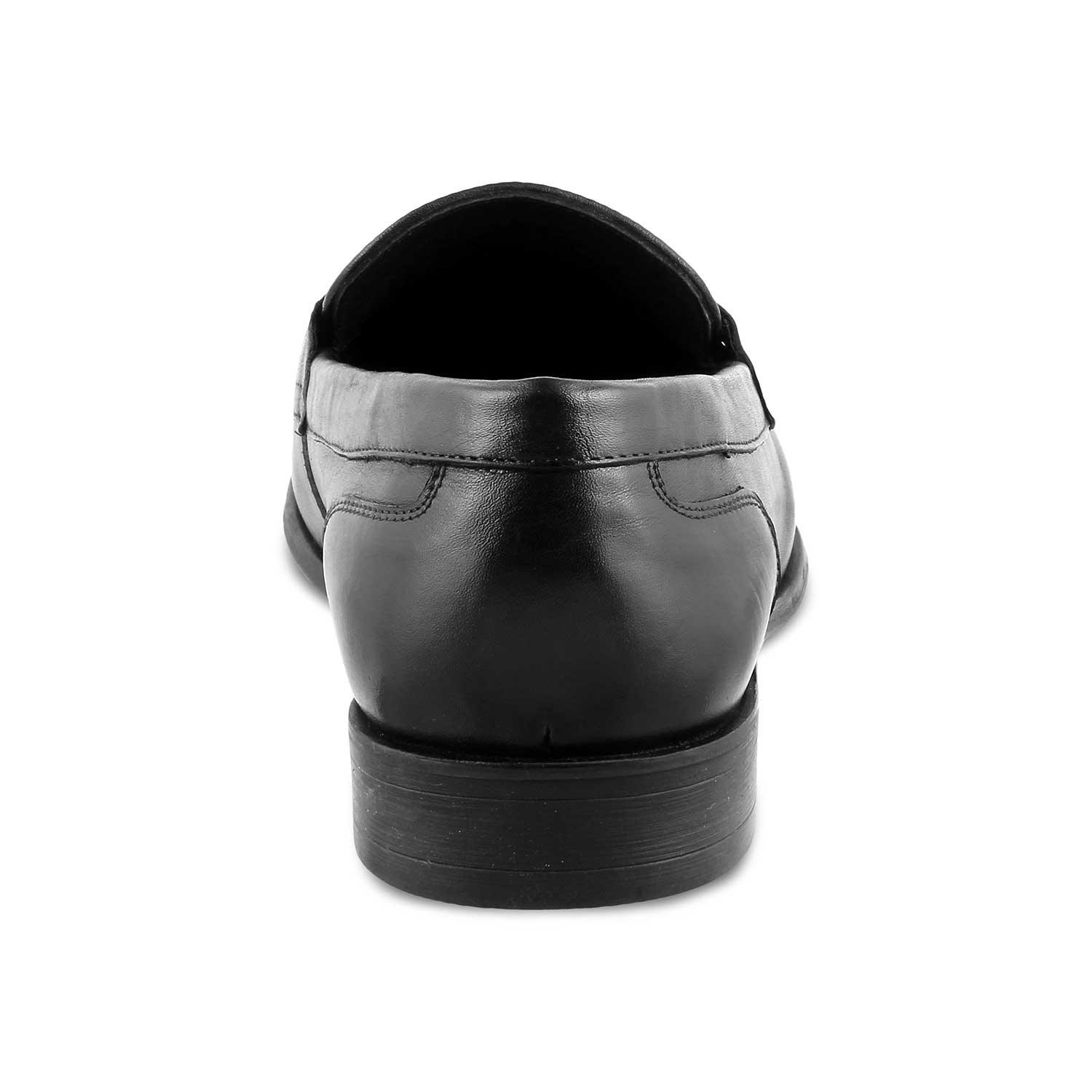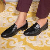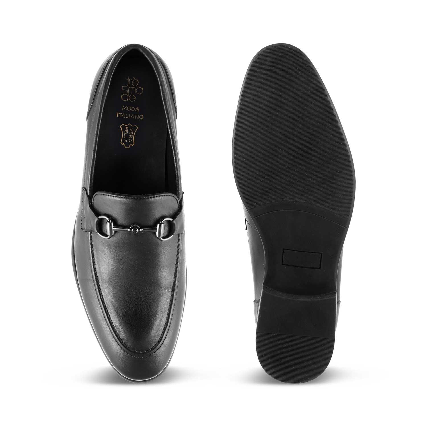 Introducing our Pierre black men’s horse-bit loafers. Crafted with the finest materials, these loafers offer a modern and sophisticated look. Be a class apart by adding this timeless style to your formal wardrobe. Pair these loafers with a maroon suit for a classic look.