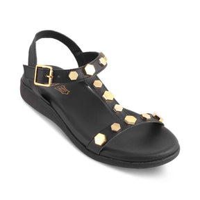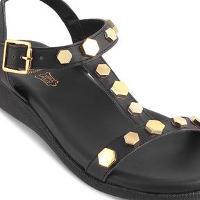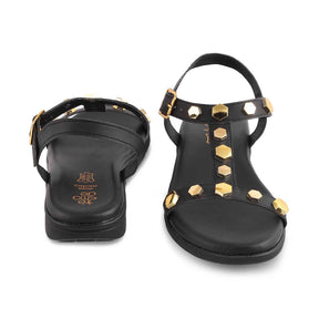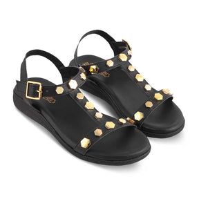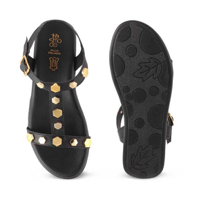 Upgrade your style game with our Stud black women's flats. Featuring golden studs, this modern pair effortlessly blends functionality and fashion. Ideal for your outings, this pair is a must-have in your collection. Style these flats with a pleated black dress and golden earrings for your dinner night.