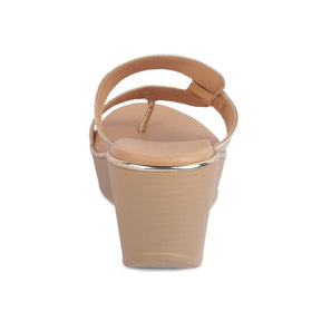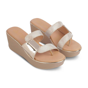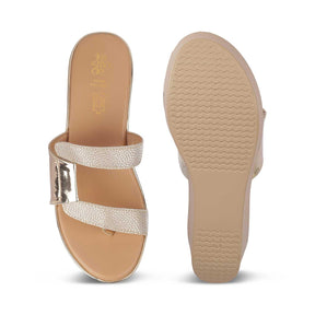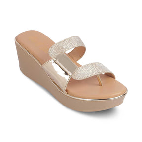 Switch on your Diva mode with our Tafila gold women's wedges. Designed for the modern women who wish to leave a lasting impression wherever they go, this pair is the one for them! With a glossy finished & meticulously designed upper and a 2.5-inch wedge height, these sandals are a must-have. For a party night, style these wedges with your outfit.
