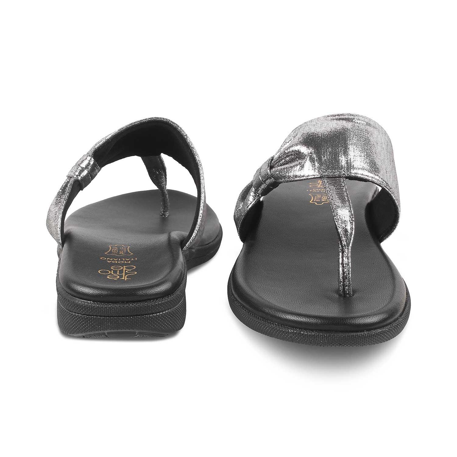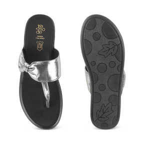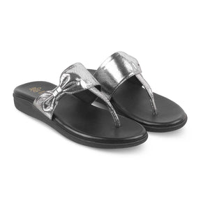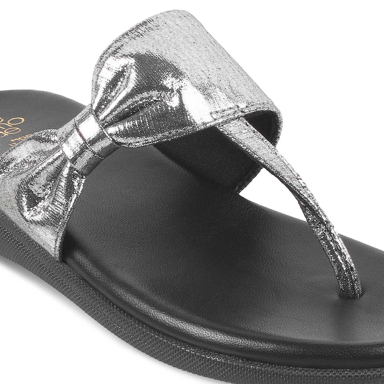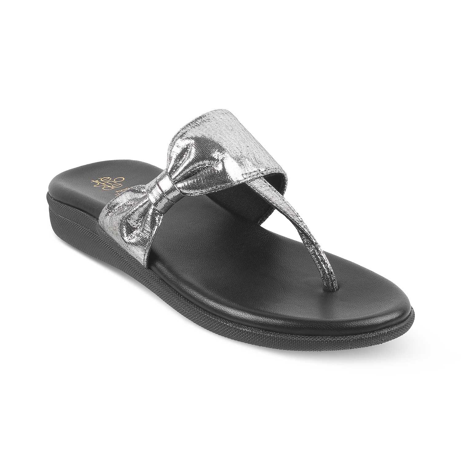 The Tobow silver is a must-have pair of flats for women. Keep up with the glam quotient in these flat sandals. Featuring a chic bow, TPR sole and created from premium faux leather, makes this pair a great companion for daily and party wear. Get complimented by styling these flats for women with a full-sleeves white top and black palazzos.
