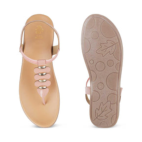 Our Velencia pink women's flats are ready to upgrade your casual look. These flats for women will make you look super stylish, while giving you the ultra-comfortable feel. This pair features a leaf-patterned strap with golden studs. Be it going for errands or a shopping spree with your girl gang, this vegan-friendly pair will accompany you through it all. Style tip - Pair these flats with a pastel pink top and black leggings.