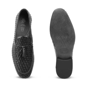 Presenting the Wove New black loafers for men. Aesthetics and comfort, go hand-in-hand in these handcrafted tassel loafers. These loafers are handcrafted in Italian leather, making them perfect for work wear. These loafers are made to last and feature tassels and a meticulously crafted intricate weave. This pair is perfect for both work and casual occasions. Simply pair these loafers with a pair of colour-blocked chinos and a white shirt to make all heads turn at the next event.