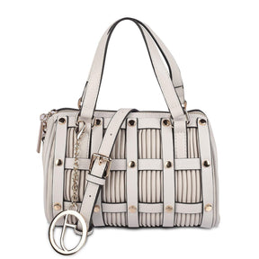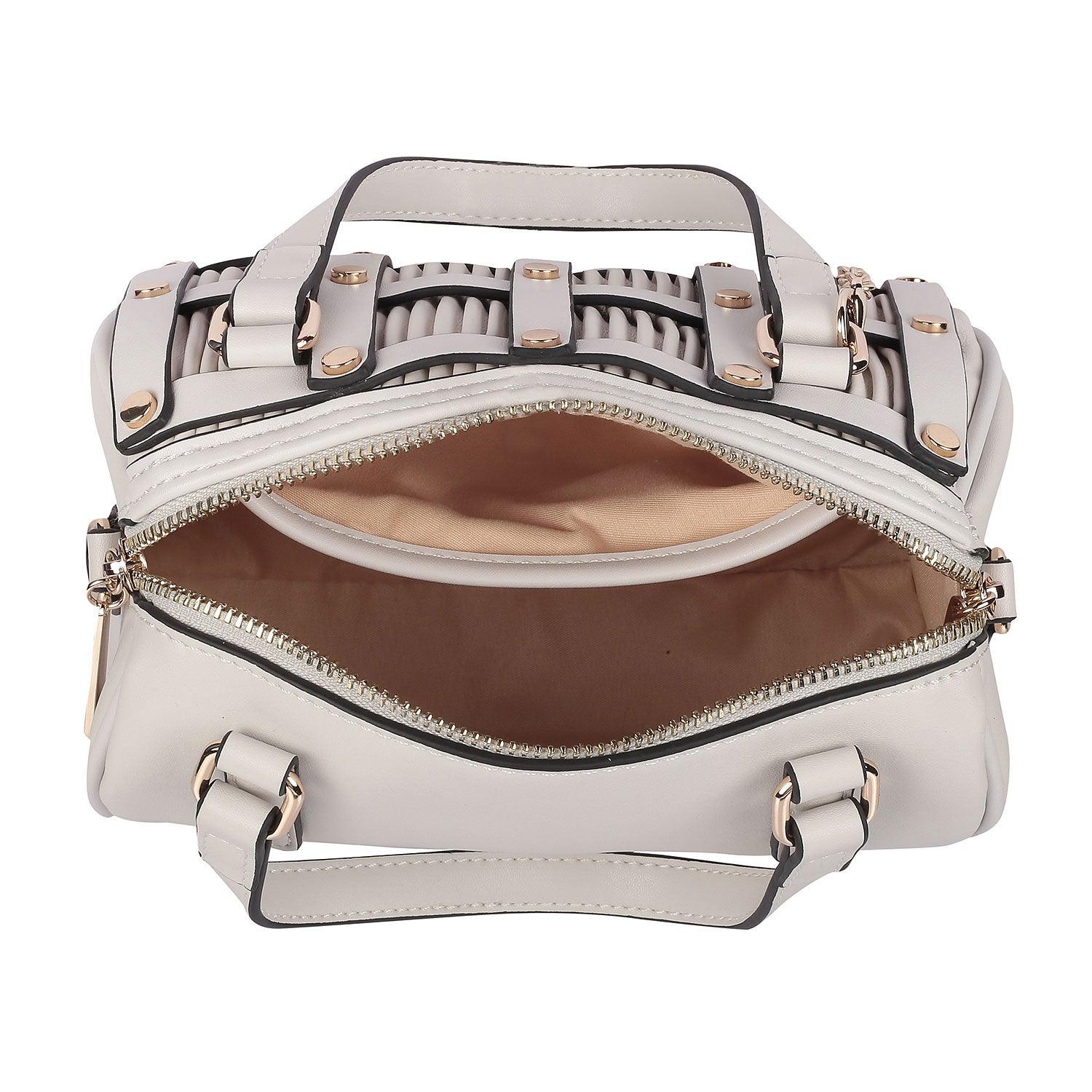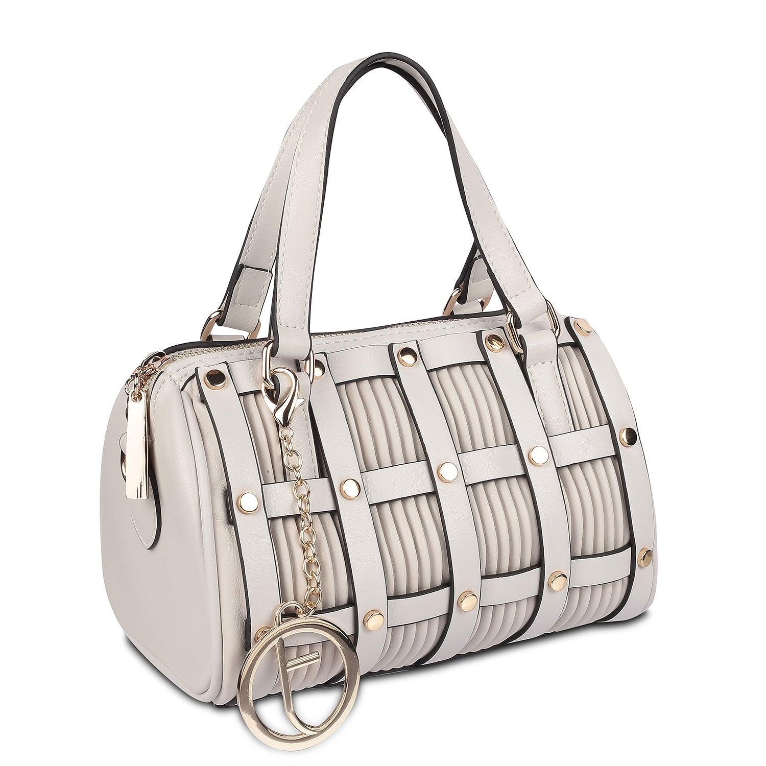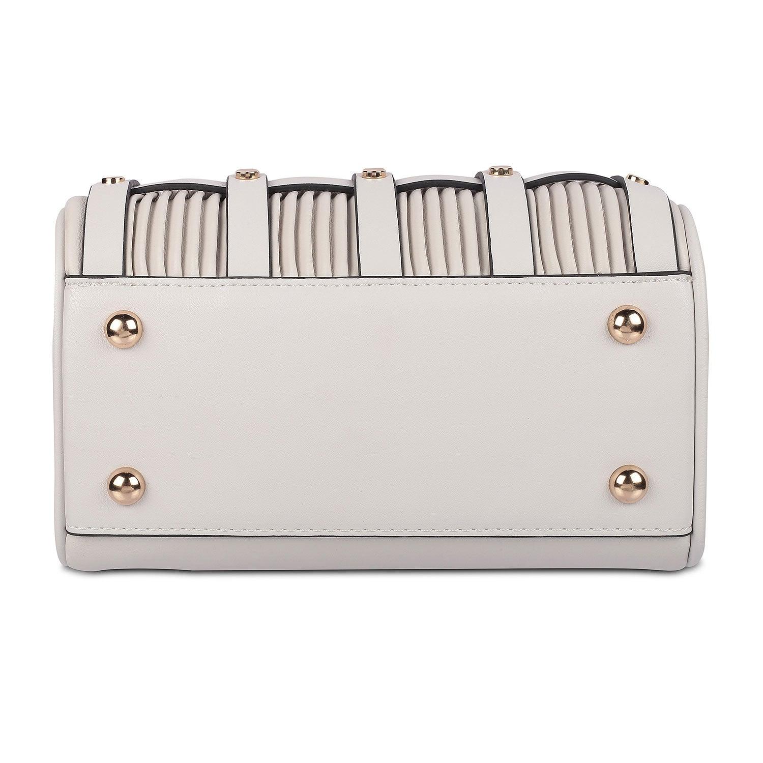 Our Air grey women's sling bag is modern and trendy. This bag has been created from premium vegan leather handbags India. With a cylindrical shape and a chic design with golden studs, this bag is quite different from the ordinary. If you want to stand out from the crowd, this bag is your answer; as it has an intricate pattern designed with care and attention to detail. This bag has a detachable strap as well. Get ready to show off your great fashion taste by styling this bag with your favourite dress for a party night.