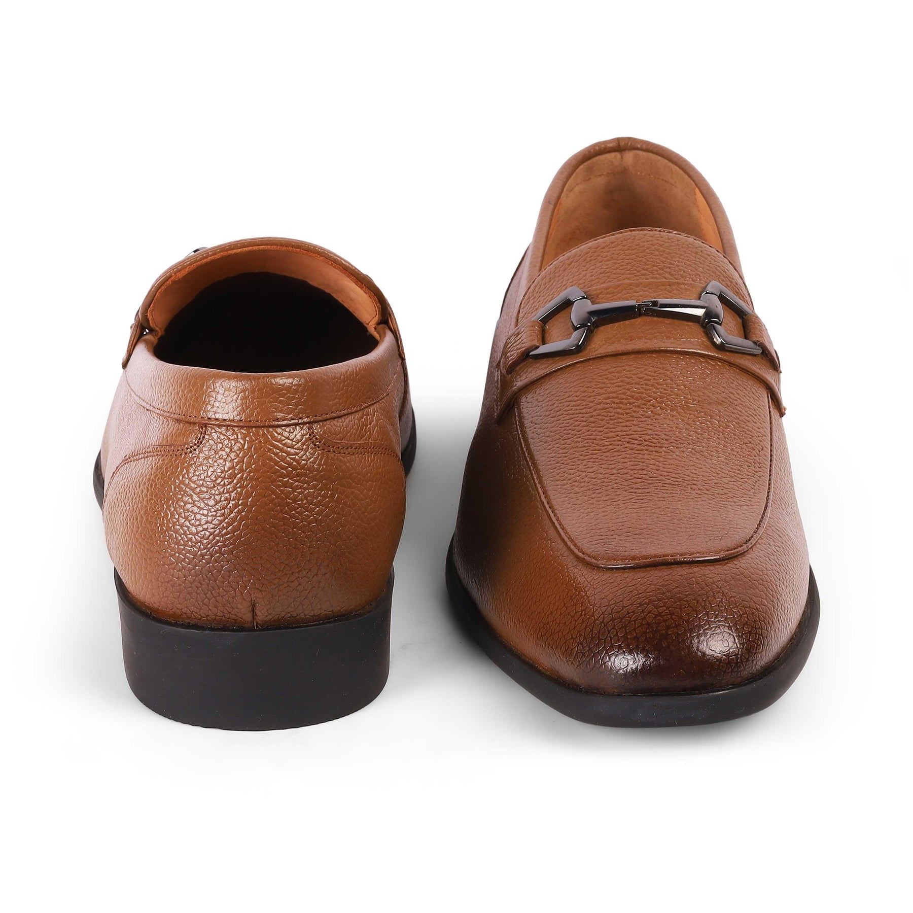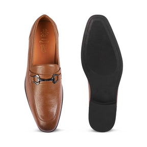 Elevate your formal look with our Antli tan men’s leather loafers. With a metallic buckle belt, these loafers are crafted with care in premium genuine leather. This pair has a TPR sole to offer a good grip, which strikes the perfect balance between style and practicality. For a boardroom meeting, style these loafer shoes for men with a formal outfit and look dapper.
