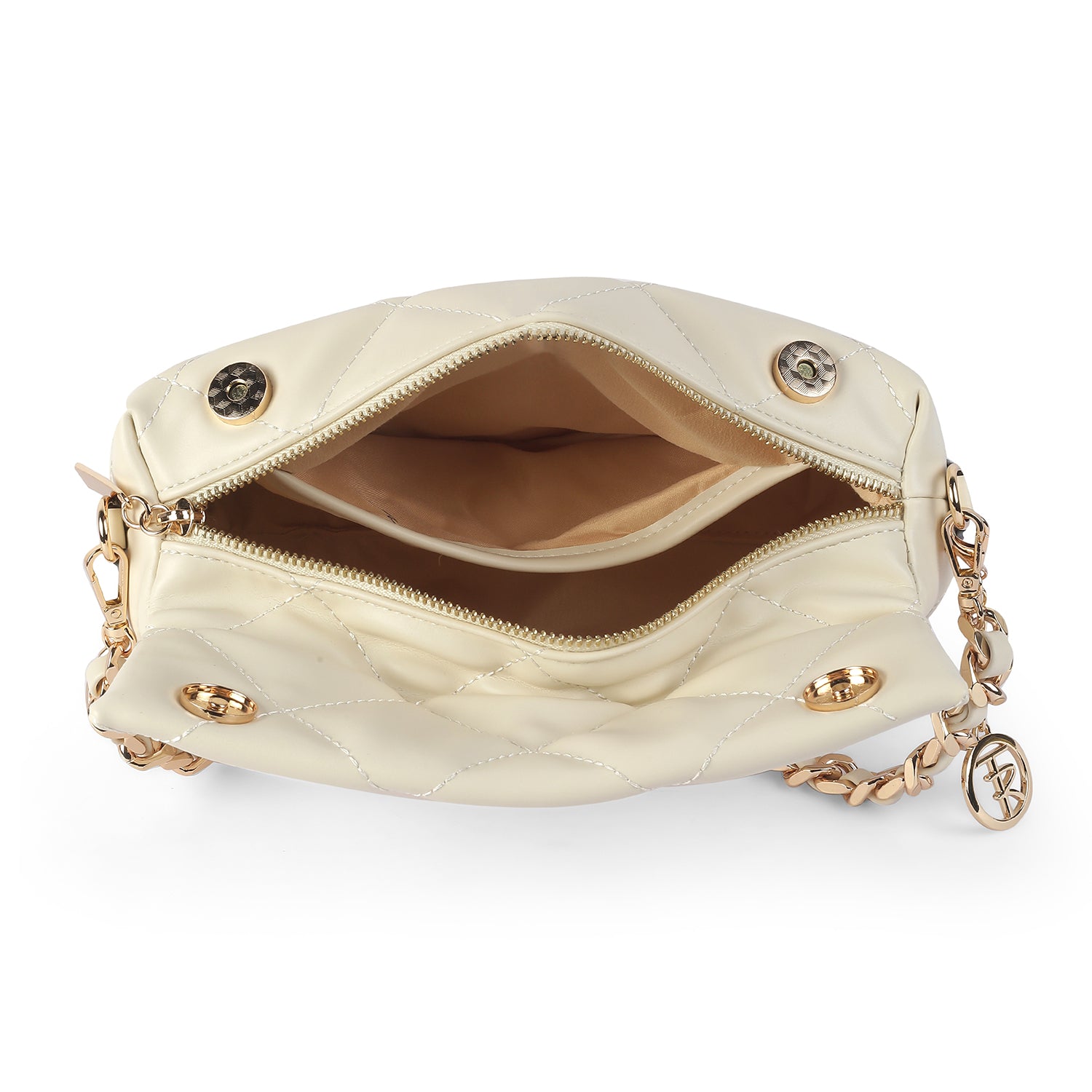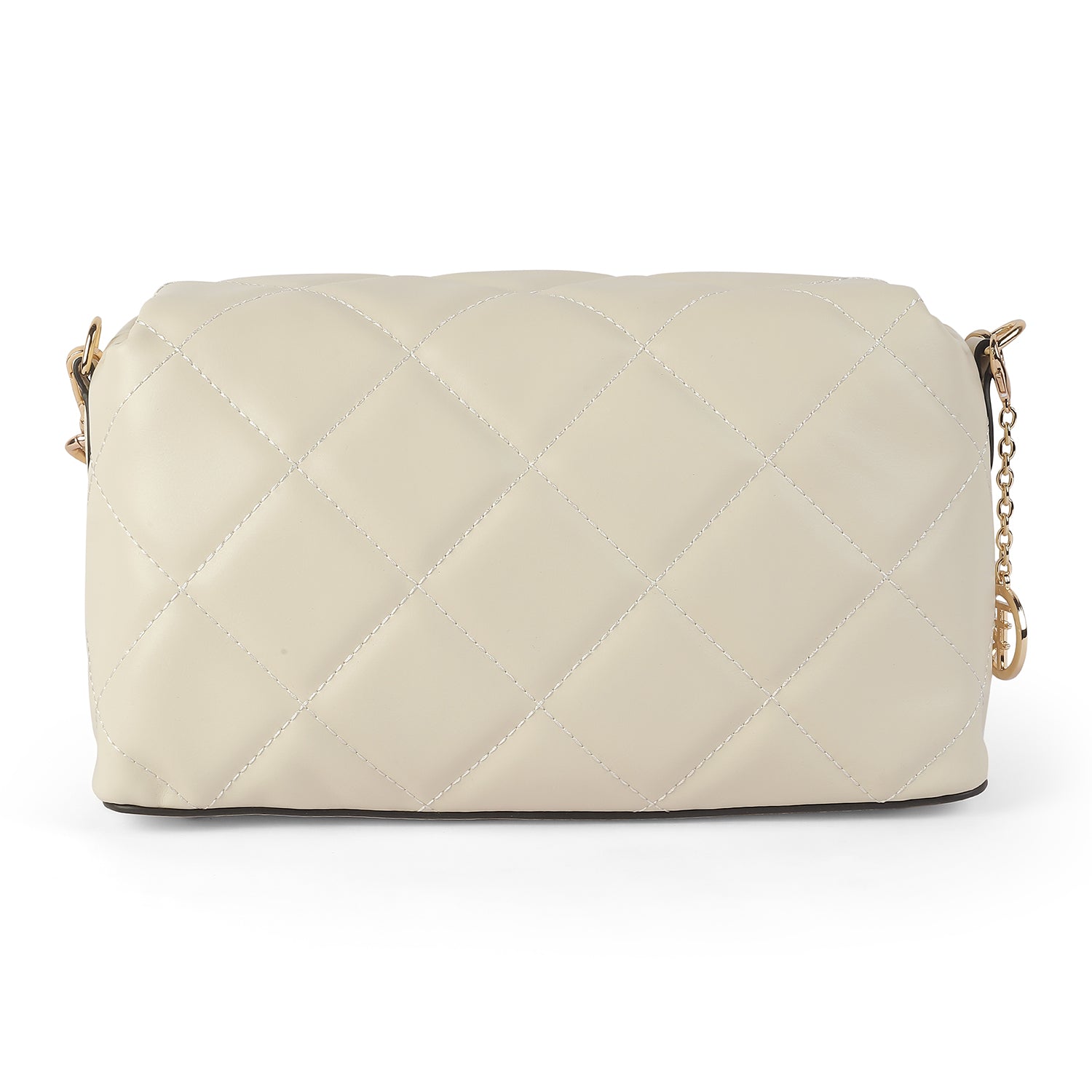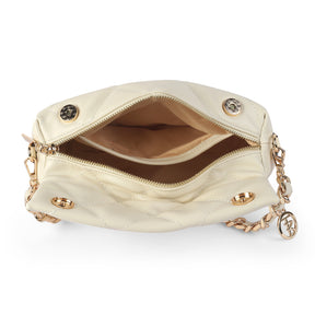 Flaunt your great fashion sense by getting our Boliva beige sling bag for yourself. With premium golden detailing and a modern criss-cross pattern, this sling bag will enhance your overall style game effortlessly. This vegan-friendly bag is spacious enough for you to store your essential items easily. Style your dress with this sling bag for a weekend outing.