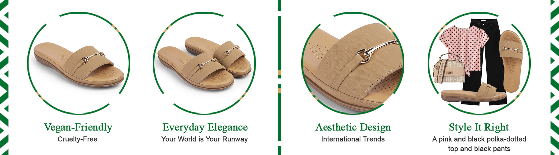 Get ready to upgrade your everyday collection by adding our Chic beige flats to your wardrobe. With a metallic buckle belt and a comfortable cushioned foot-bed, these flats for women are not just minimal but also super comfortable. The best part about these flats is that they will go well with all your outfits. This beige footwear will help you make a style statement without having to compromise on the comfort factor.
