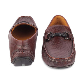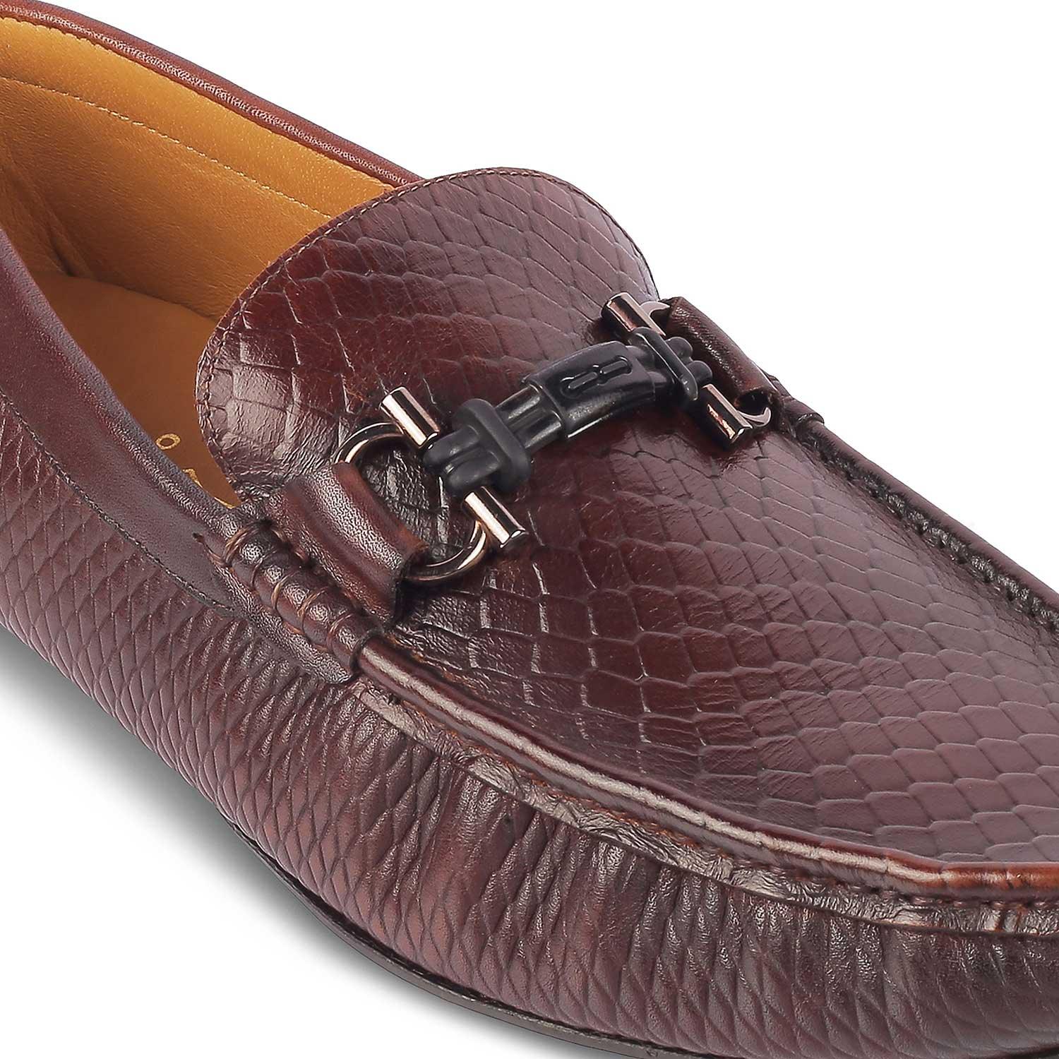 Flaunt your look with our Ferro brown men's loafers! With a classic buckle on the upper and a trending croc-embossed design, these loafer shoes have been crafted in premium leather and are ideal for your formal and semi-casual looks. Transition effortlessly from 9-to-5 to your party night by adding these sophisticated driving loafers to your wardrobe.