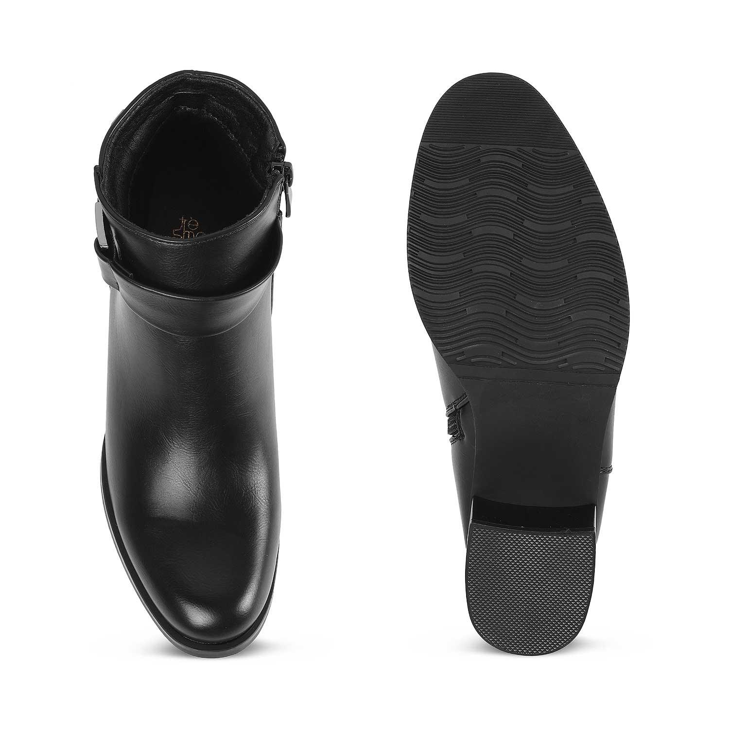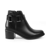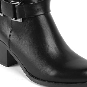 Enhance your collection of boots by getting our Geneve black for yourself. With a metallic buckle belt and a 2-inch heel height, these ankle-length boots for women are both classic and comfortable. With a TPR sole for added comfort, this versatile pair is created from premium PU material. Team these women’s boots with a casual outfit for your everyday look.