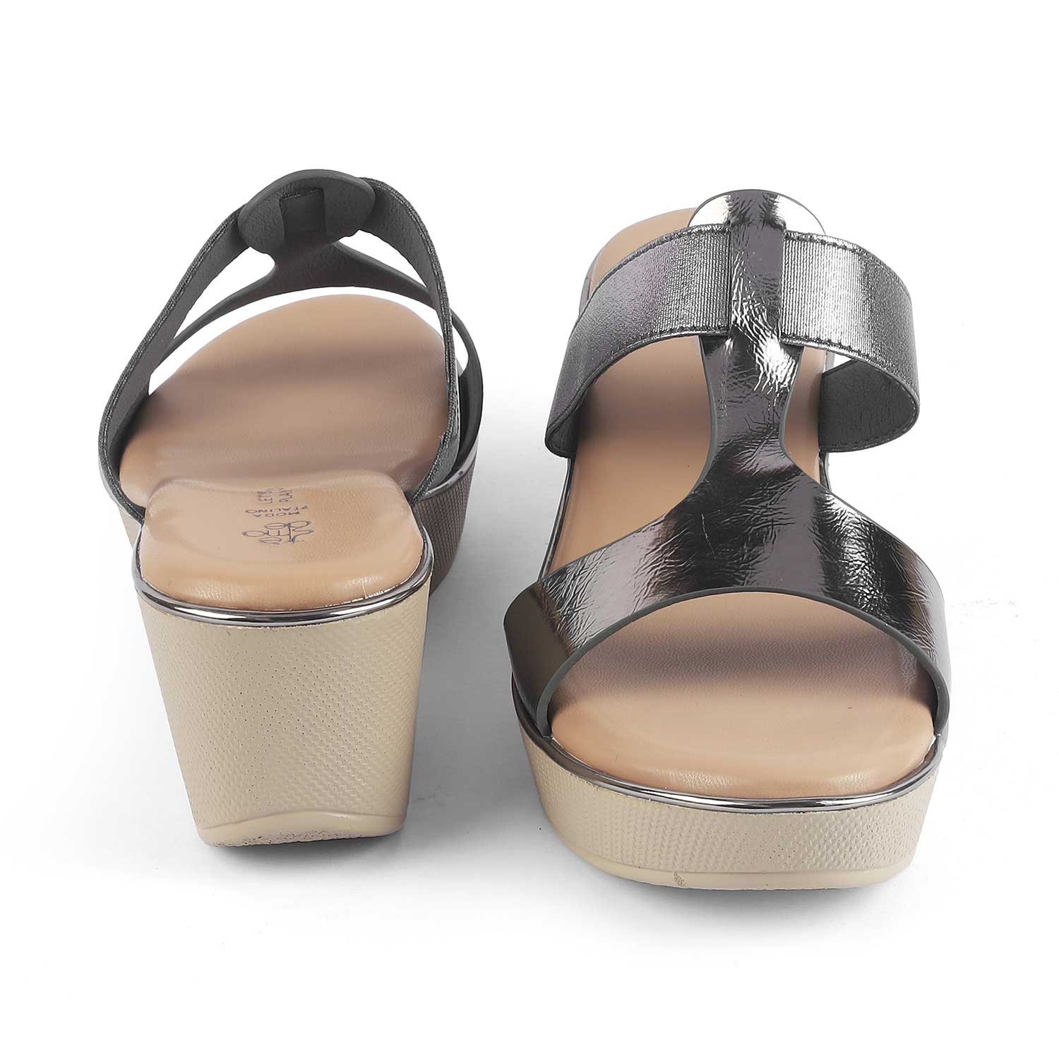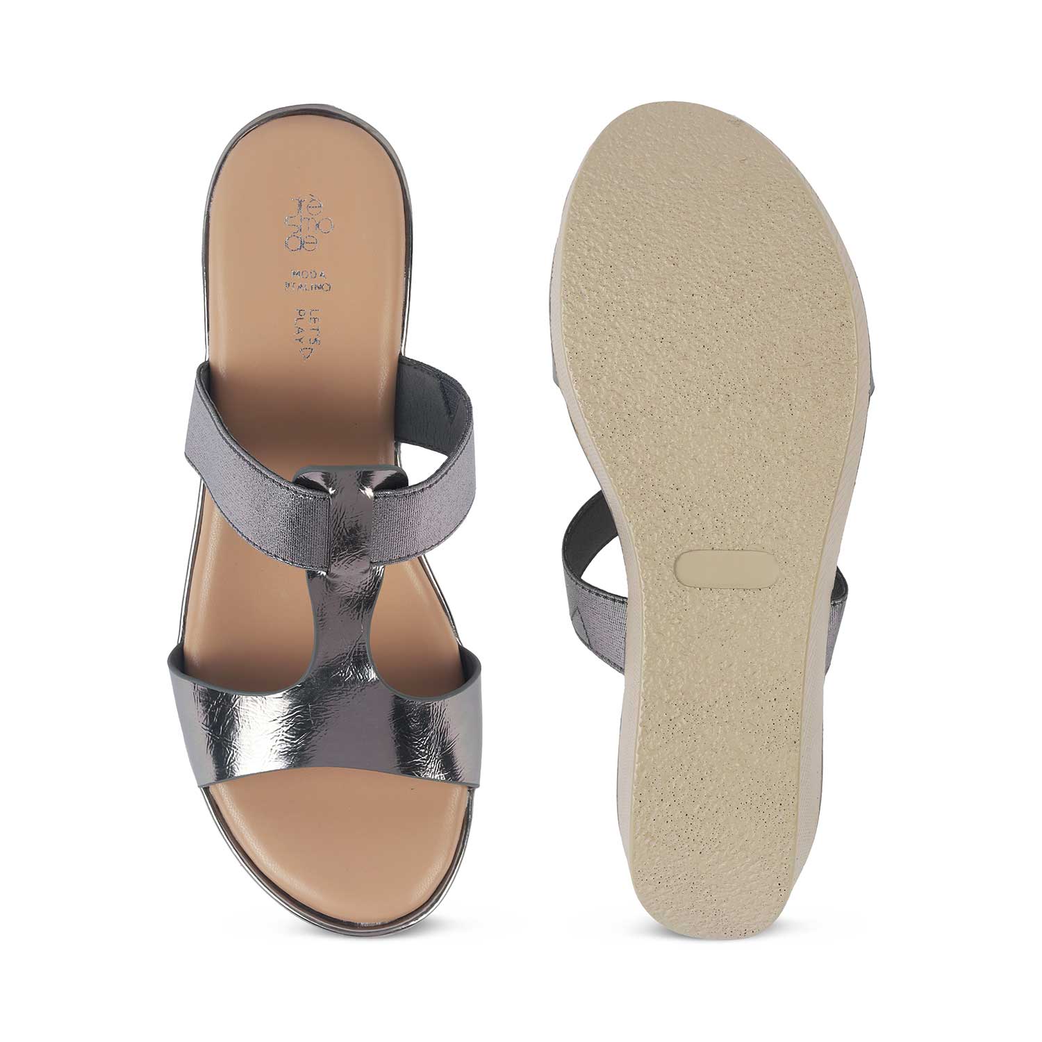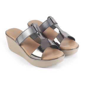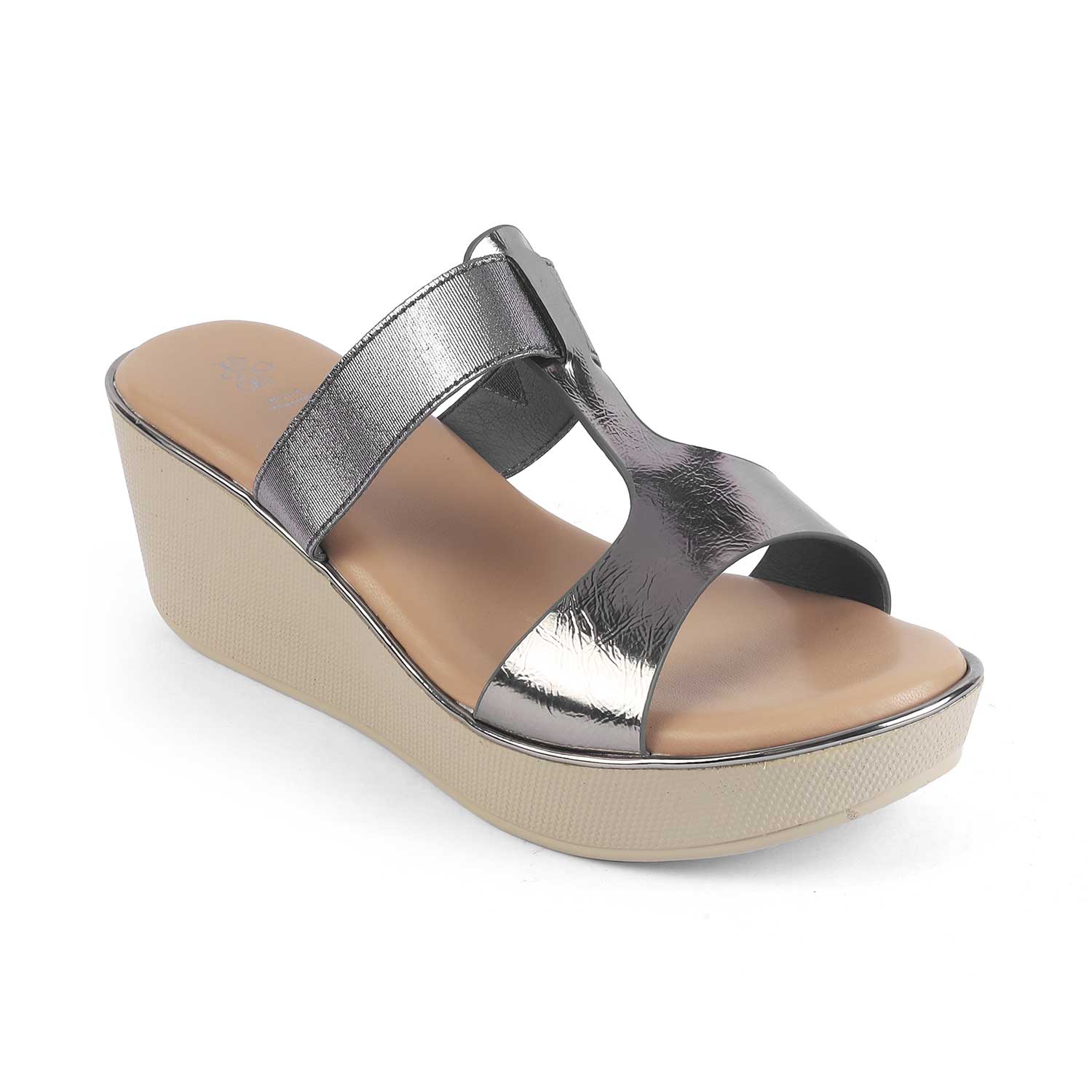 Our Miglo Pewter women’s wedges will remind you to shine brighter! With a 7.6-cm wedge height and classic golden upper with a contemporary design, these wedges for women are a must-have for your festive functions and event nights! Carefully created from vegan-friendly leather, these TPR sole sandals will make a great addition to your wardrobe. Style them with a traditional dress for a party night.