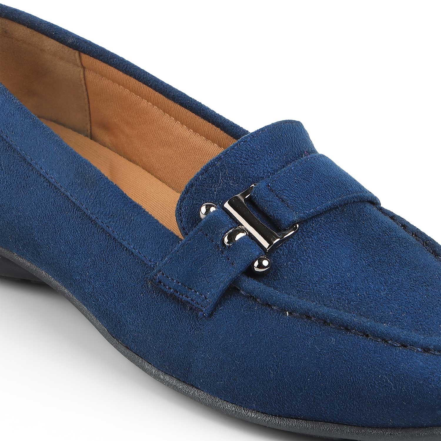 Redefine your everyday style game by getting yourself our Sli blue loafers for women. Created with care from premium suede leather and featuring a metallic buckle belt, these sophisticated Tresmode shoes will be your go-to. You can keep it simple by styling these loafers with a minimal outfit or opt for a vibrant outfit to stand out from the crowd.