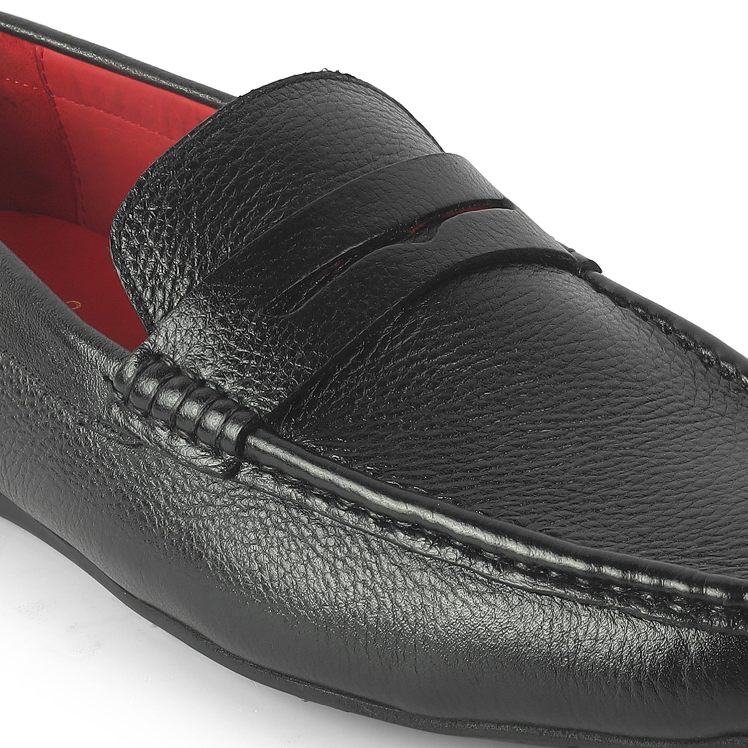 Redefine your everyday style by adding our Slipon black penny loafers for men to your collection. Crafted in premium genuine leather with a penny strap on the upper, these loafers will be your go-to! This versatile pair has a TPR sole for utmost comfort. Attend your work meetings in style by pairing your formal outfit with these loafer shoes.