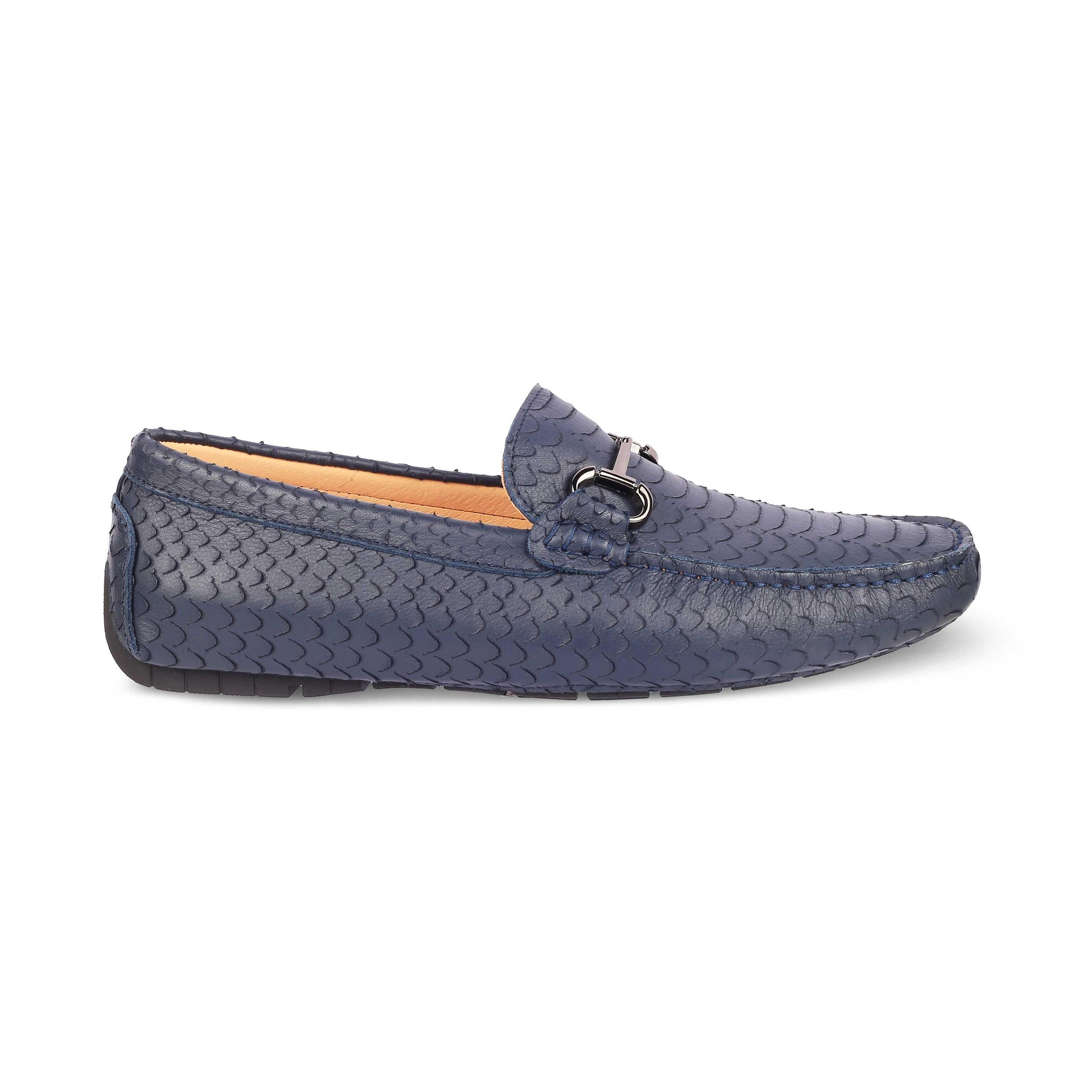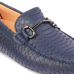 Level up your weekend getaway style with our Sofi blue leather driving loafers for men. With a trending croc-embossed pattern and a metal buckle on the upper, these premium leather loafers are a go-to! These shoes have a comfortable TPR sole. Upgrade your collection by adding this versatile pair to your collection. For a semi-casual look or a getaway, team these loafers with your daily wear.