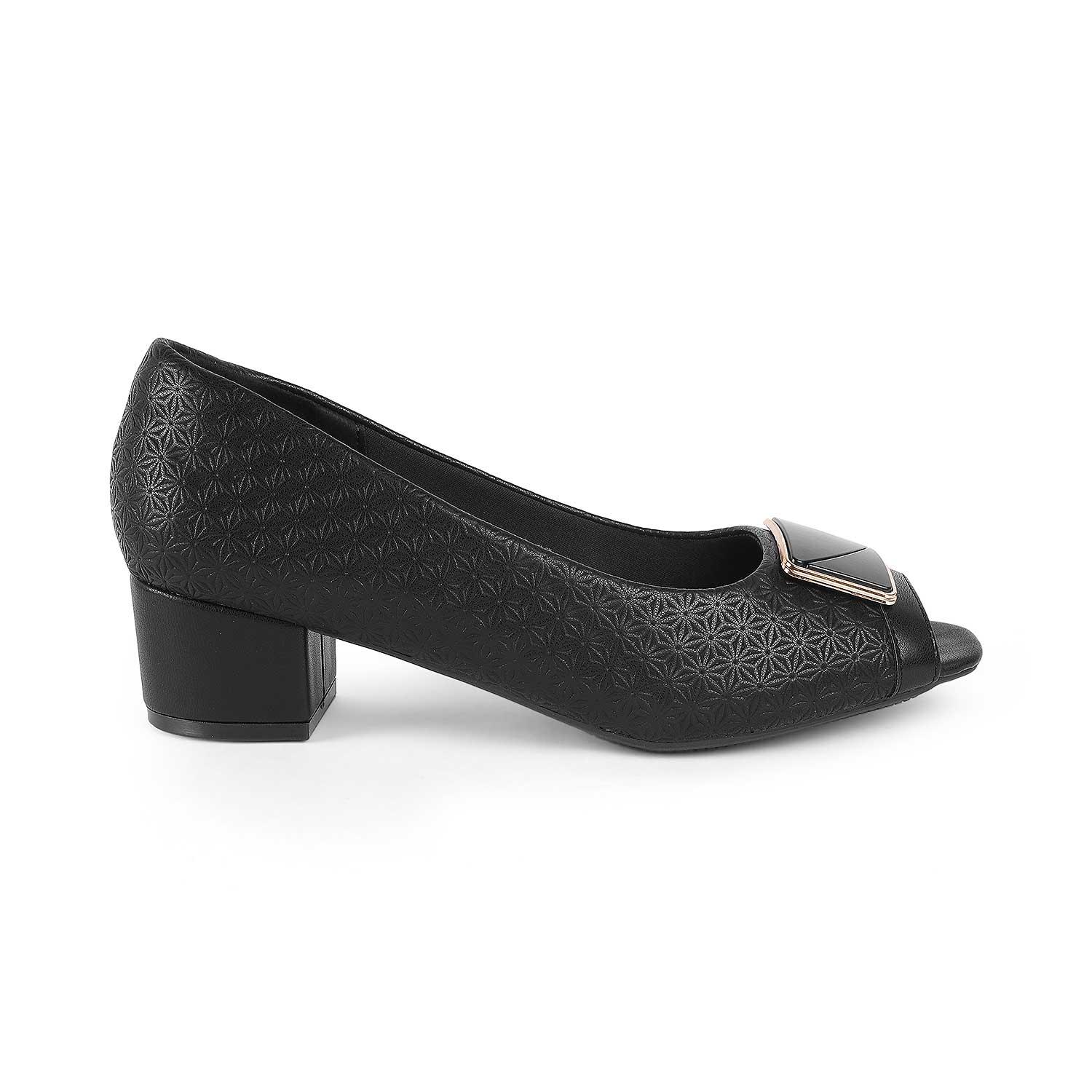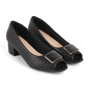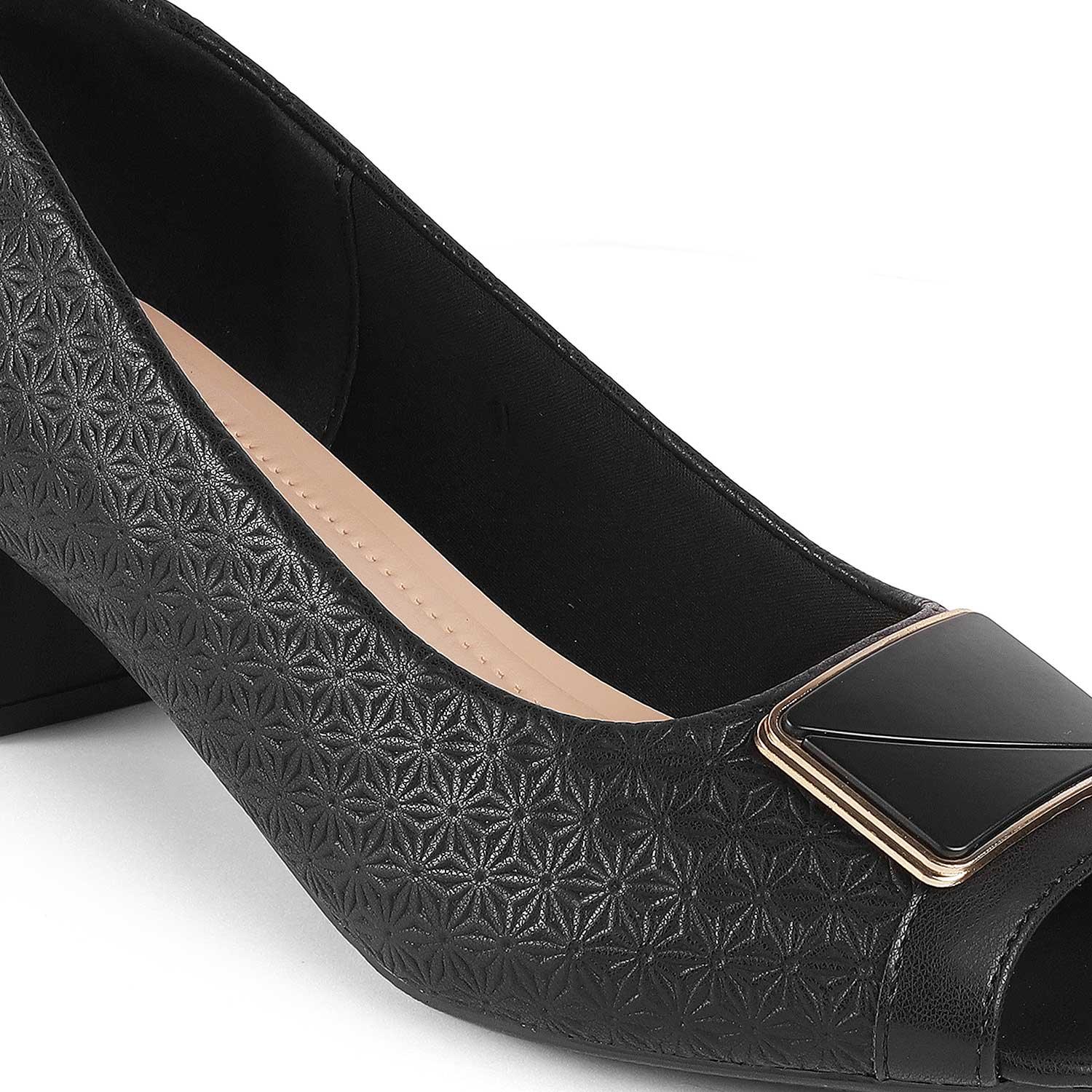 Our Treroy black peep toe heels are all you need for a charming look! With a 5-cm heel height and textured design on the upper, these heels are ready to upgrade your sense of style. These vegan-friendly peep toe heels for women have a TPR sole for a good grip. Get ready to enhance your party look by styling your dress with this classic pair.