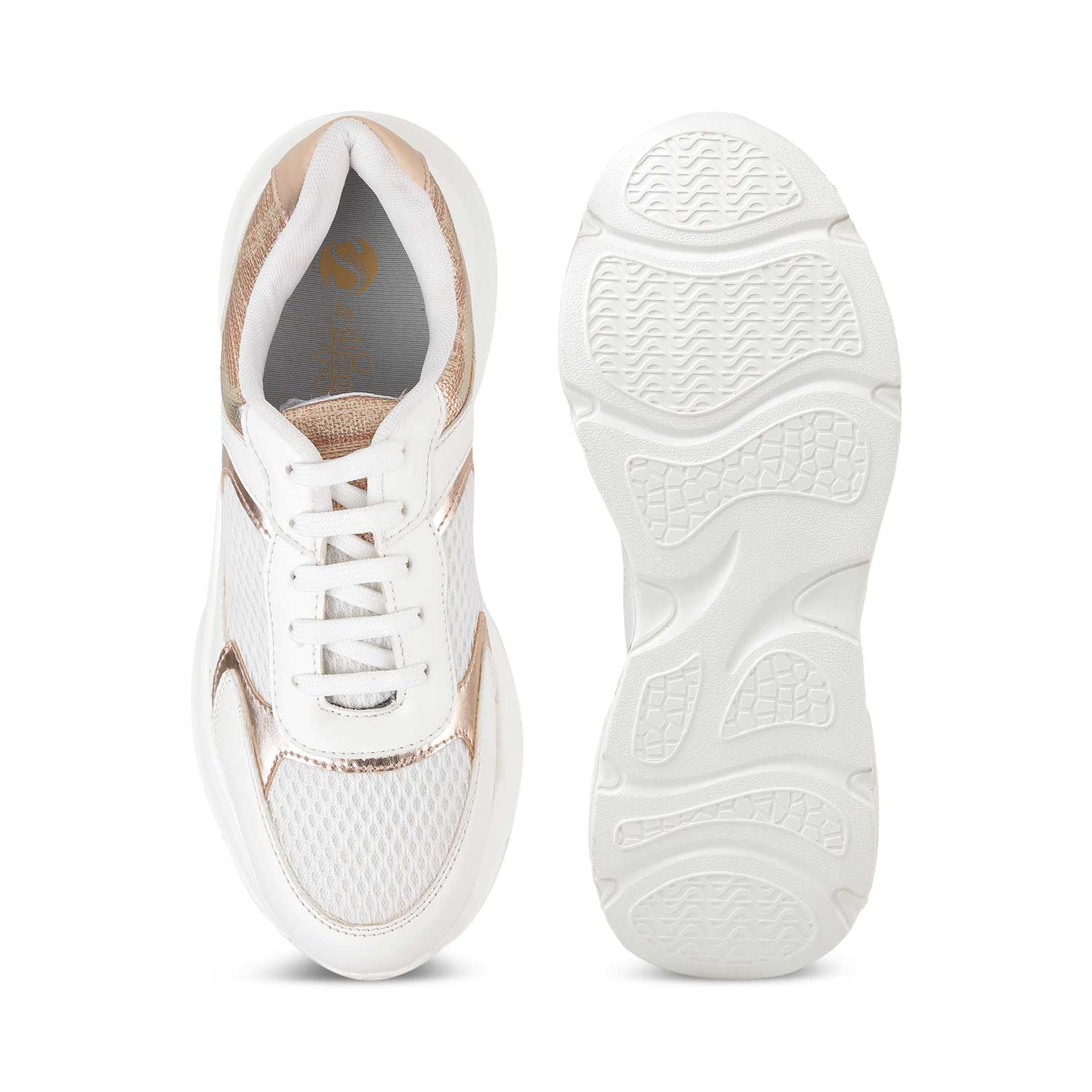 Our White champagne sneakers for women will help you ace your athleisure look. Created from vegan-friendly material and featuring a modern design with golden detailing, these sophisticated sneakers are the ultimate must-haves. This pair has a TPR sole for utmost comfort. Add these luxurious sneakers to your collection and make a style statement while you walk gracefully.